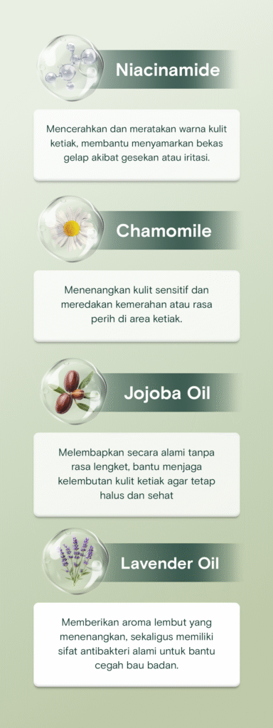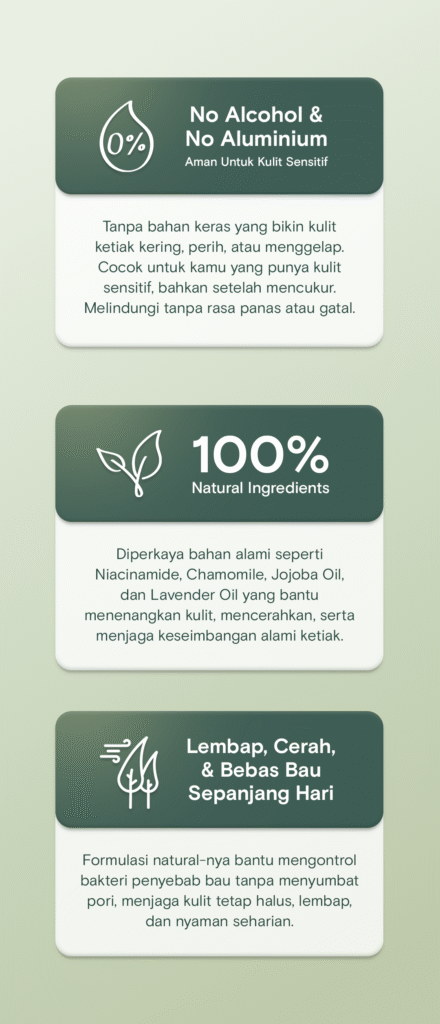 Aman buat kamu yang punya kulit ketiak sensitif, gampang merah, atau sering iritasi. Tanpa aluminium, alkohol, baking soda, atau fragrance yang biasanya bikin kulit perih & makin kusam.